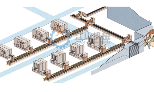 集中輸送裝置は、1つの作業場に1本の主搬送裝置といくつかの支線輸送裝置を設置する。工作機械によって発生した切屑は、支線輸送裝置から主搬送裝置に搬送され、さらに主搬送裝置が切屑集中処理所に搬送される。