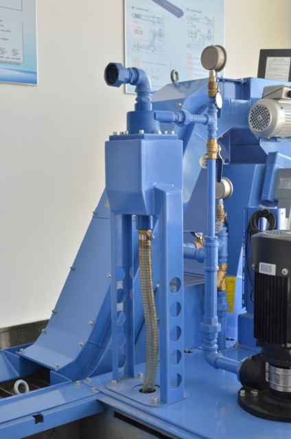 從流入口流入的液體邊渦流狀下降,邊通過離心力分離異物。分高的異物沿著錐體內壁下降,和液體一起從下部噴嘴排出。另外,分離了異物的液體在下部噴嘴部位形成上升渦流,向吐出口排氣。